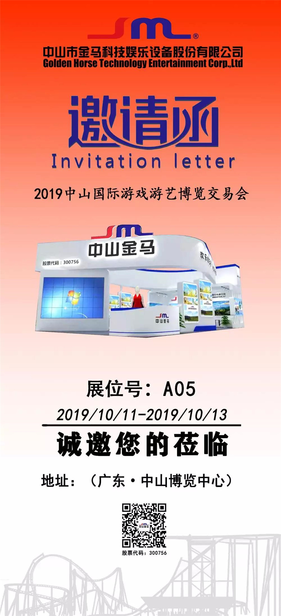 【中山金馬】尊敬的先生\女士:衷心的感謝您及貴公司對中山金馬一如既往的支持和信賴,我司即將參加2019中山國際游戲游藝博覽交易會,在此我們誠摯的邀請您前來觀展。