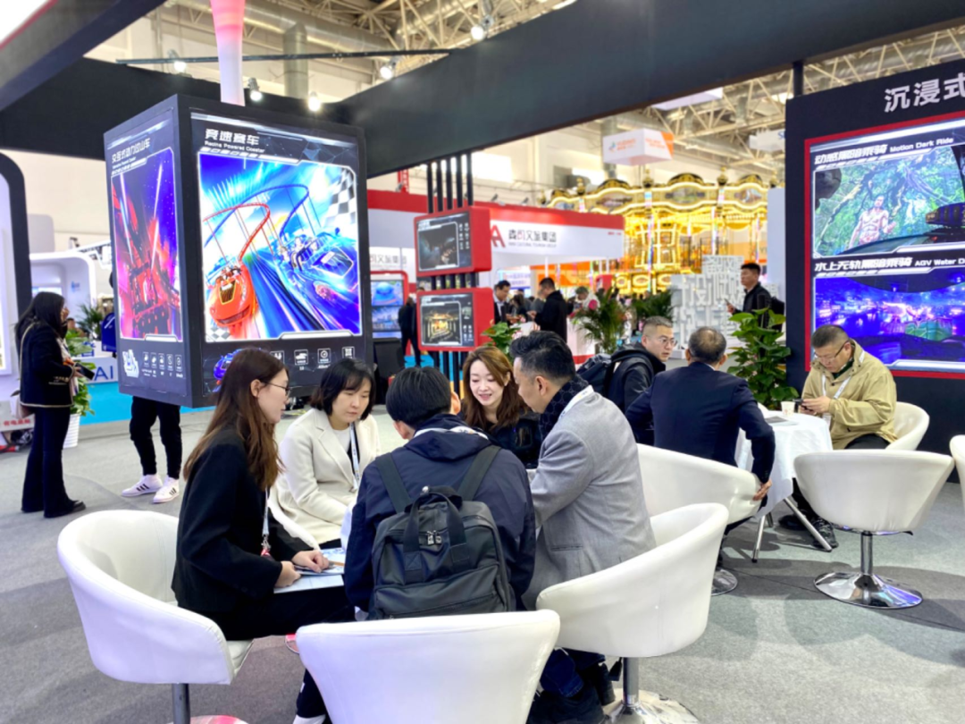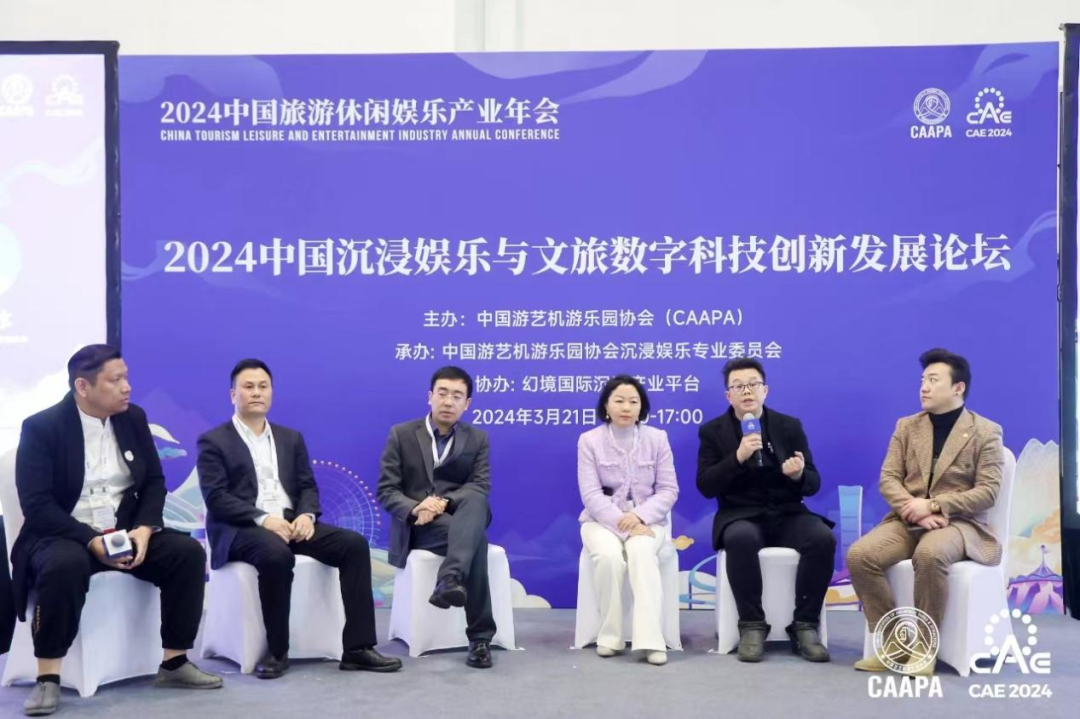 展會期間還同期舉辦了2024中國旅游休閑娛樂產(chǎn)業(yè)年會-2024中國沉浸娛樂與文旅數(shù)字科技創(chuàng)新發(fā)展論壇,公司副總經(jīng)理林澤釗作為受邀嘉賓出席并參與了“沉浸產(chǎn)業(yè)服務(wù)供應(yīng)鏈體系融合”主題圓桌討論,與業(yè)內(nèi)同仁就“技術(shù)創(chuàng)新是如何制造體驗(yàn)賣點(diǎn)和驅(qū)動消費(fèi)”、“面對2024年行業(yè)商業(yè)變量的應(yīng)對策略”等熱點(diǎn)話題展開探討。林澤釗副總經(jīng)理表示:在虛擬沉浸式項(xiàng)目中,創(chuàng)意概念的落地能力尤為關(guān)鍵,打造高沉浸感體驗(yàn)極其考驗(yàn)多維一體的技術(shù)集成能力,得益于金馬游樂多年技術(shù)投入,近年多個國內(nèi)首創(chuàng)虛擬沉浸項(xiàng)目順利落地,沉浸效果備受肯定與青睞;面對如今市場多元化、輕體量、快交付的需求特點(diǎn),金馬游樂正通過技術(shù)平臺整合來加快創(chuàng)新技術(shù)成果轉(zhuǎn)化,源源不斷為市場供給新產(chǎn)品,引領(lǐng)行業(yè)向新而行。