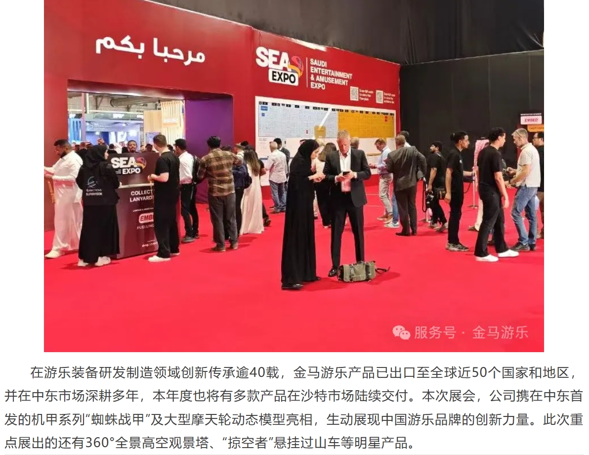 5月20日,全球游樂行業(yè)焦點(diǎn)之一的2025 SEA沙特展在沙特利雅得前沿會(huì)展中心盛大開幕。隨著“沙特2030愿景”加速推進(jìn),中東文旅產(chǎn)業(yè)將迎來黃金發(fā)展期。金馬游樂搶抓市場機(jī)遇,攜高品質(zhì)創(chuàng)新產(chǎn)品與全球服務(wù)方案閃耀亮相本次展會(huì),與全球伙伴共拓中東千億級市場新機(jī)遇!