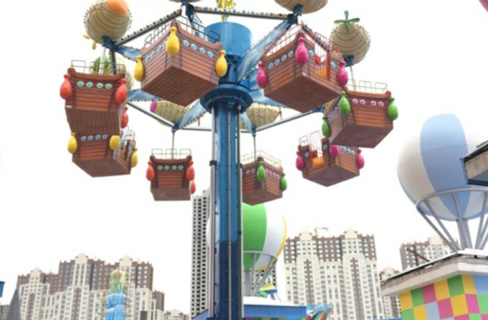 集旋轉(zhuǎn)、升降運(yùn)動(dòng)形式于一體的自控飛機(jī)類游藝機(jī)。逍遙塔是一款適合家庭游玩的游樂(lè)設(shè)備。設(shè)備啟動(dòng)后,座艙在升降運(yùn)動(dòng)的同時(shí)繞立柱中心軸旋轉(zhuǎn),同時(shí)座艙還可以自由旋轉(zhuǎn),運(yùn)動(dòng)過(guò)程乘客可以體驗(yàn)到乘坐游玩的樂(lè)趣。