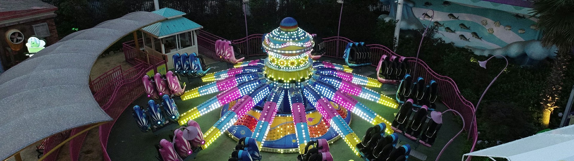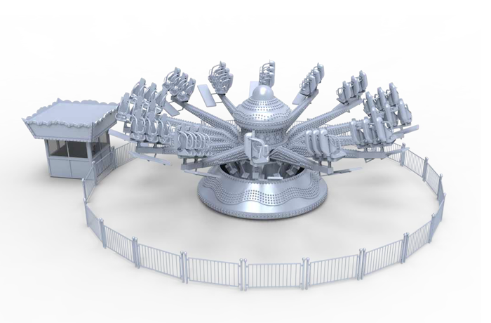 彈跳機(jī)中軸為中心帶動(dòng)周圍十四個(gè)座艙繞豎直中軸旋轉(zhuǎn),同時(shí)座艙伴隨著音樂(lè)進(jìn)行高低、快慢不同的跳躍式運(yùn)動(dòng)。使乘客在過(guò)程中體驗(yàn)到旋轉(zhuǎn)加跳躍的樂(lè)趣。
