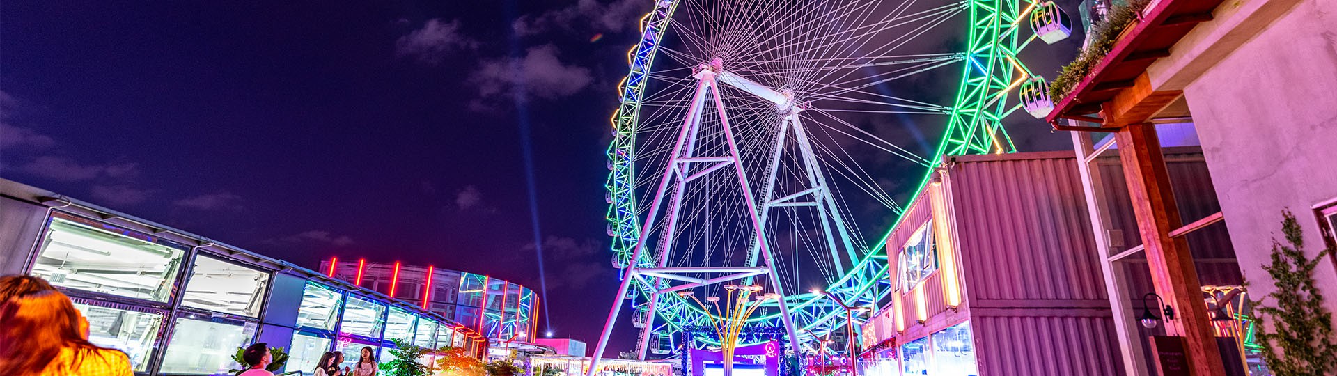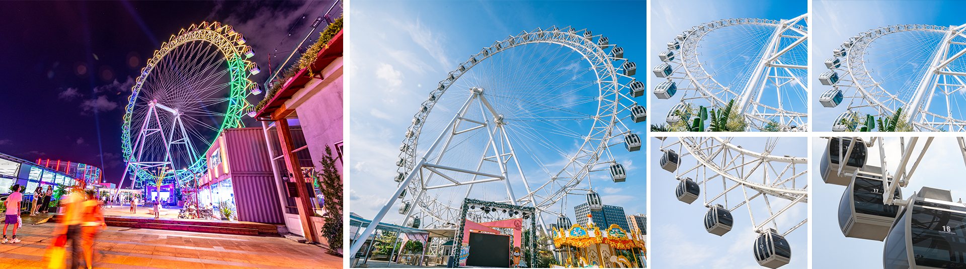 62米觀覽車,塔架由6根立柱構(gòu)成,轉(zhuǎn)盤為輻條式,轉(zhuǎn)盤上均勻分布著36個吊廂。吊廂運(yùn)作時配以明麗變幻的燈飾,搭配別具匠心的現(xiàn)場配景,以及柔美動聽的背景音樂,乘客在吊箱內(nèi)平穩(wěn)悠閑地縱覽周邊美景。