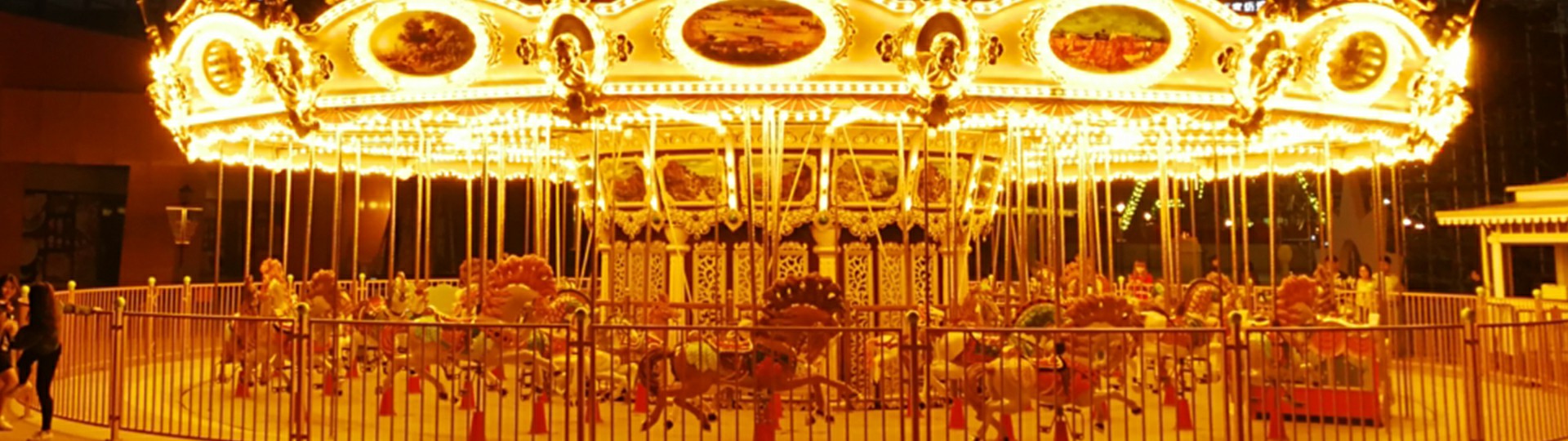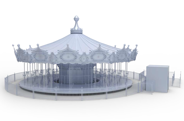 豪華轉馬采用歐洲皇家的古典豪華的裝飾風格,頂棚華麗,內外圍板鑲嵌著彩色浮雕和絢爛彩燈,馬匹及宮庭式馬車結合多彩的花飾,造型精致夢幻。