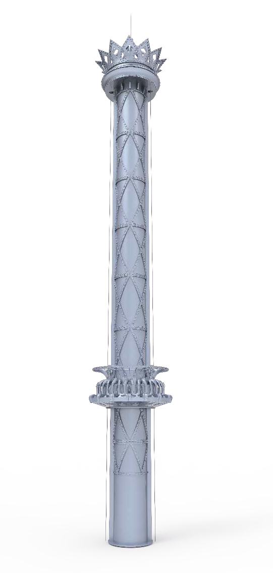 旋轉(zhuǎn)太空梭集傳統(tǒng)跳樓機(jī)豎直升降運(yùn)動(dòng)和旋轉(zhuǎn)運(yùn)動(dòng)于一身,運(yùn)動(dòng)方式多樣新穎,其簡(jiǎn)形塔架可繞其自身下端轉(zhuǎn)動(dòng),滑行架跟隨塔架旋轉(zhuǎn)的同時(shí)支撐座椅沿塔架豎直軌道做升降運(yùn)動(dòng)。