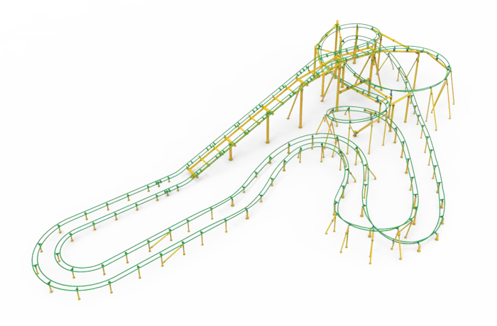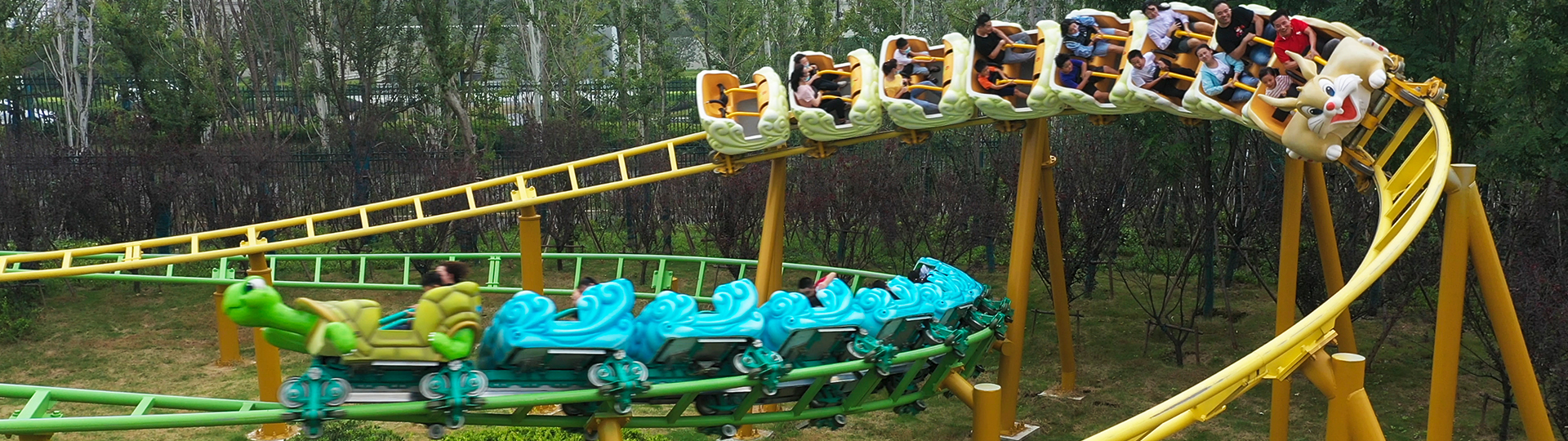 雙軌家庭過山車,共有A、B兩條軌道交互布局,每條軌道上各運(yùn)行一列車,兩列車可同時(shí)出發(fā),雙車并行如競速賽跑,故又名“龜兔賽跑”。競賽元素為乘客提供更加有趣的乘坐體驗(yàn),適合親子家庭群體游玩。