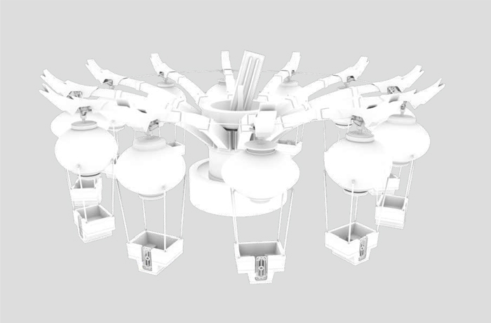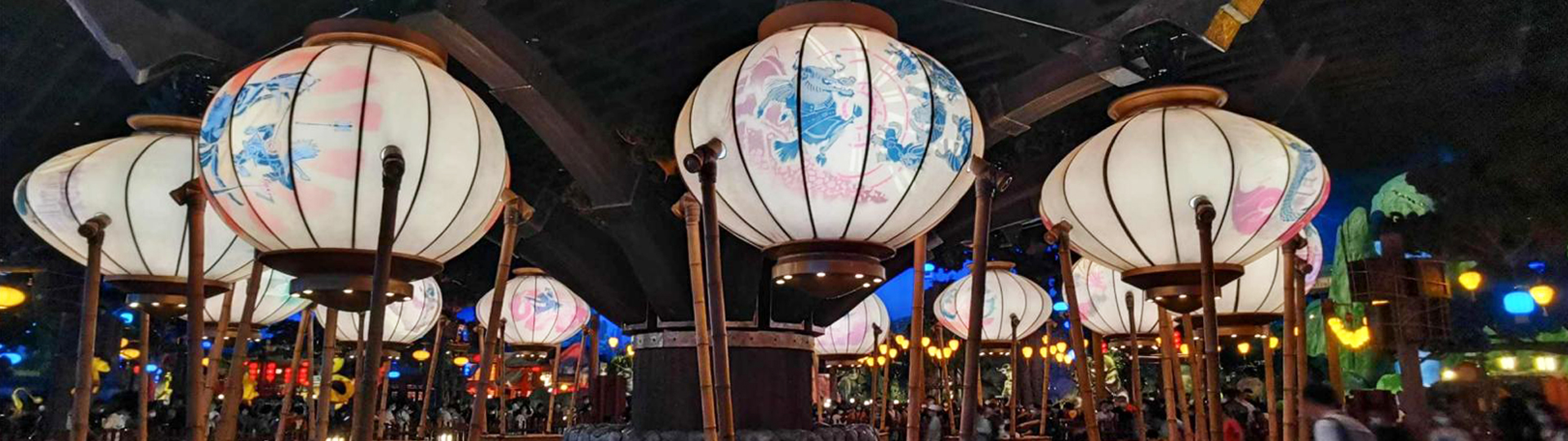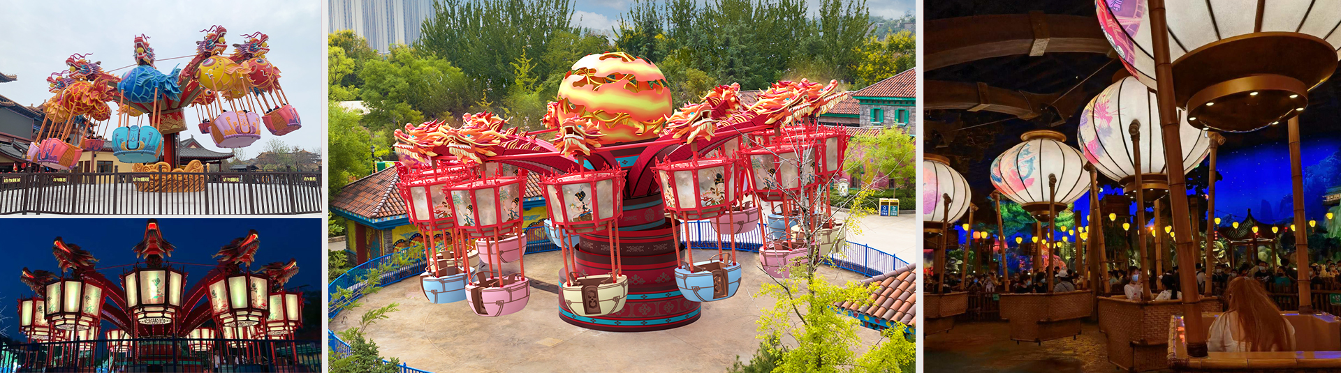 逍遙花燈集旋轉(zhuǎn)、升降運動形式于一體。在運行過程中,轉(zhuǎn)盤會以15°的傾?進行旋轉(zhuǎn),乘客在吊籃中邊體驗離心力作用下的外擺及高低起伏的回旋飄蕩,邊欣賞燈籠光影變幻下的皮影故事。