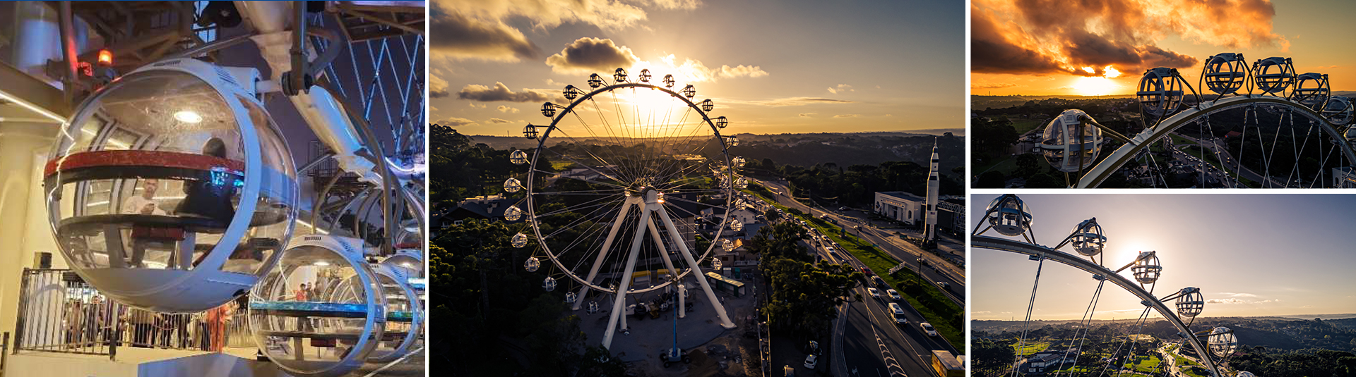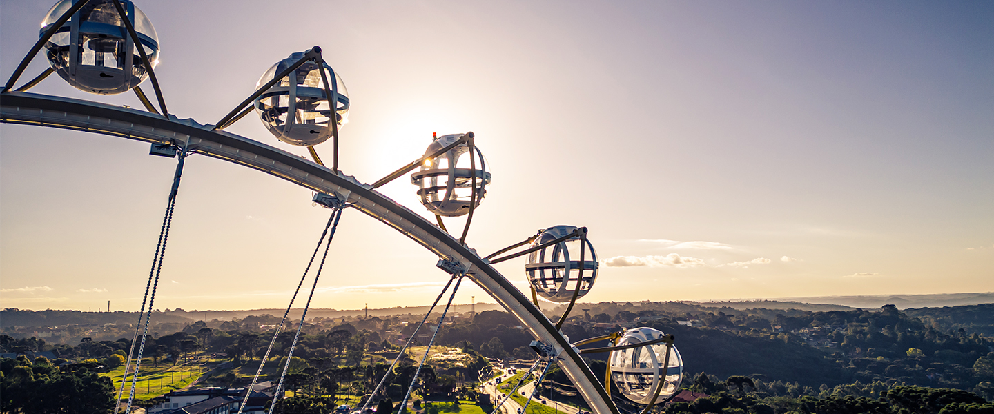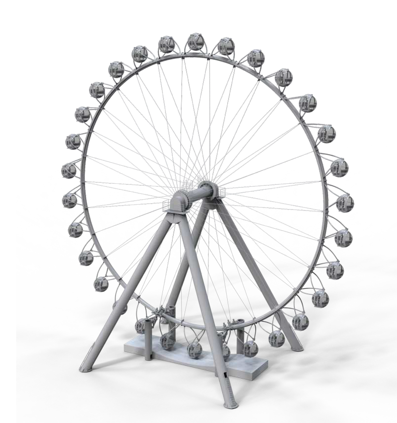 觀覽?塔架采?新穎的4?柱?橫梁極簡結(jié)構(gòu),搭配單管輻條式轉(zhuǎn)盤和圓球艙,整體姿態(tài)盡顯現(xiàn)代簡約之美。觀覽??轉(zhuǎn)盤上均勻分布著30個?珠般的圓球吊廂,單管輻條式設(shè)計令艙內(nèi)觀景視野開闊通透,可供180?觀光。在夜間滿環(huán)律動的燈光能瞬間點(diǎn)燃夜場?氛推?觀覽激情。