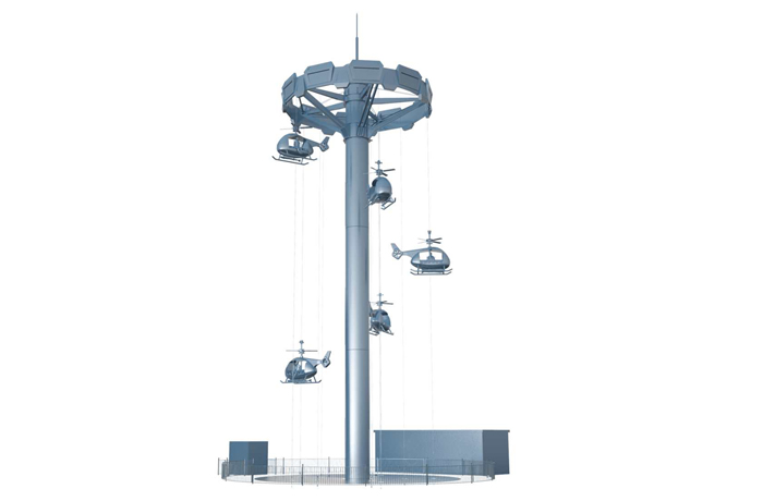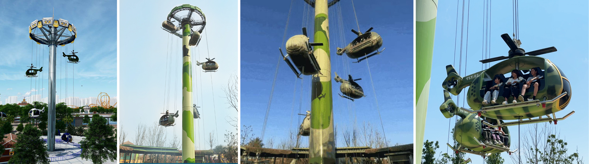 以中國?助研制直-5直升機為設計靈感,模仿直升機運??式制作的?款游樂設備。直升機的座艙外形,配備軍裝迷彩的配?;打破傳統(tǒng)新穎的背靠背的乘坐?式,觀景視野更開闊。運?時,乘客猶如在直升機中,時?升?頂端,時?上下起伏,頂上和尾翼的旋翼會隨上升下降?配合轉動。